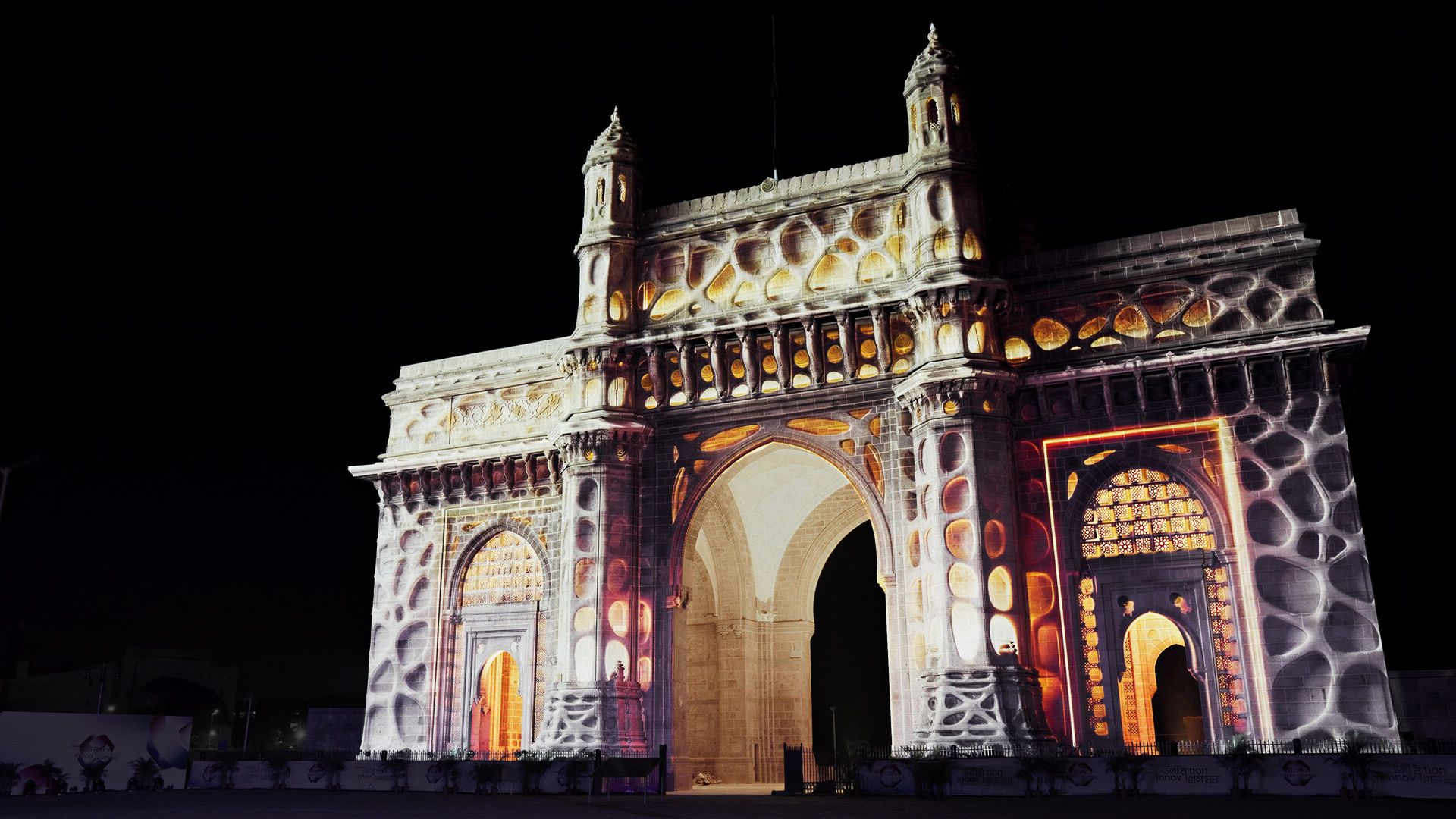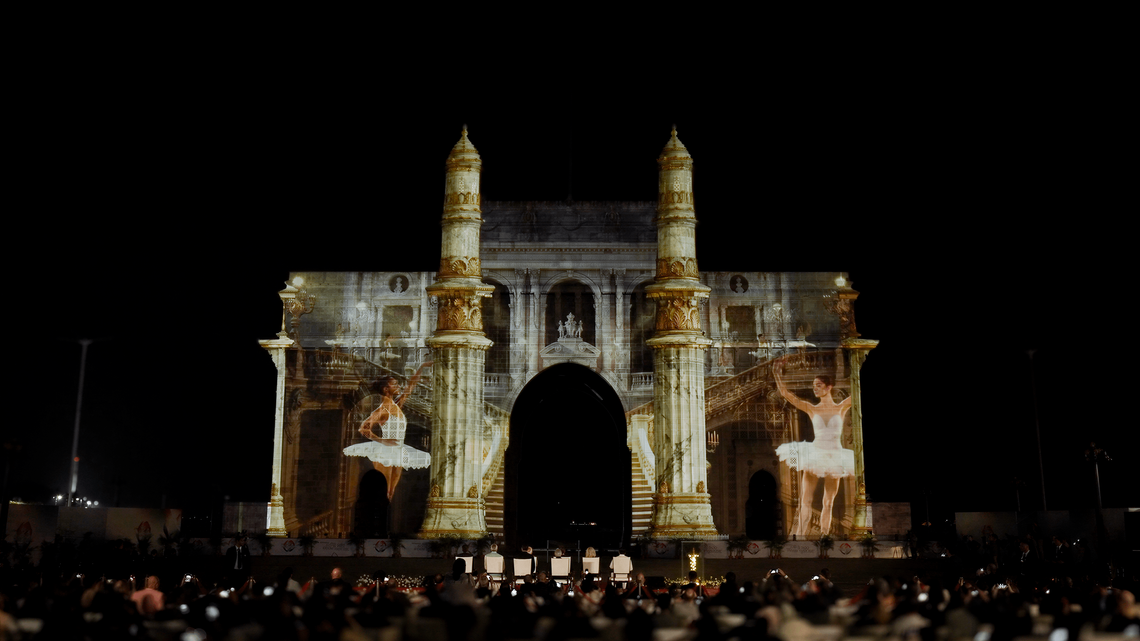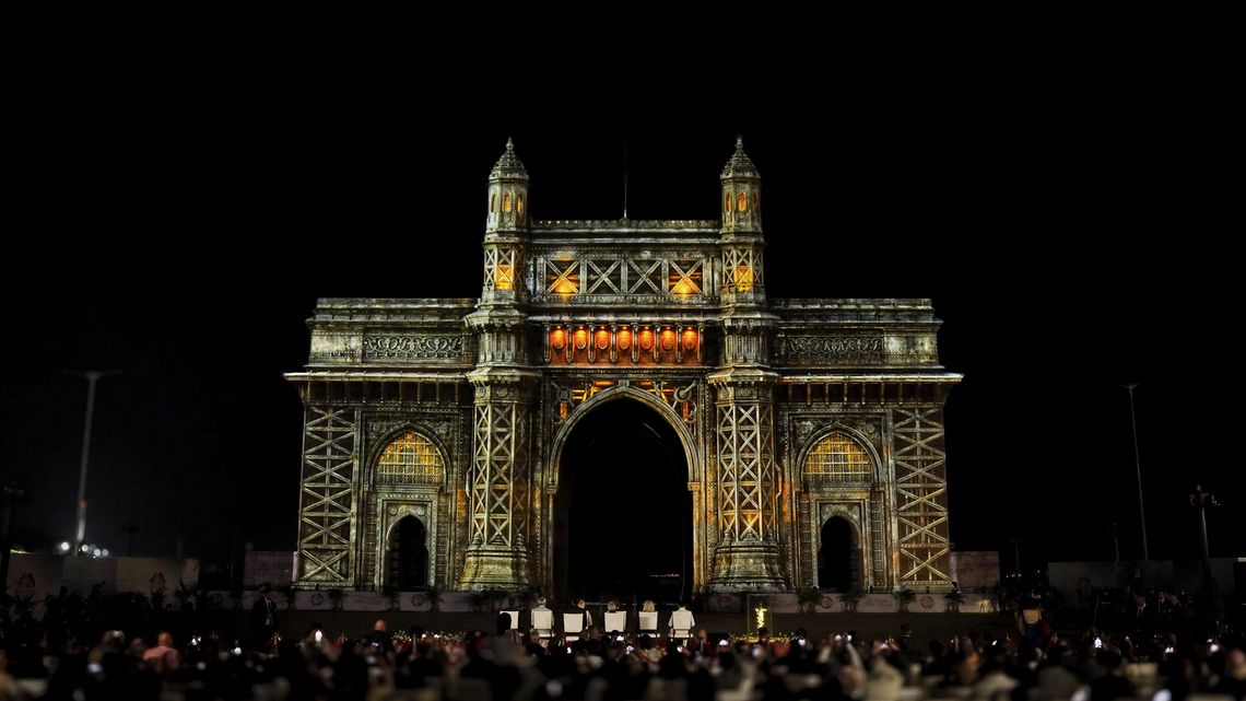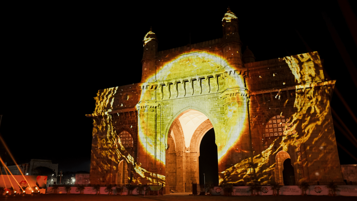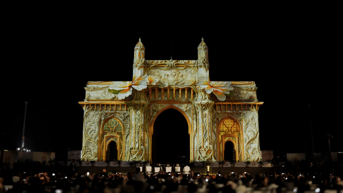 On the façade of the Gateway of India in Mumbai, the projection “A Shared Horizon” transformed the architecture into a dynamic narrative surface, enhancing its volumes, symmetries, and details through light, rhythm, and movement.